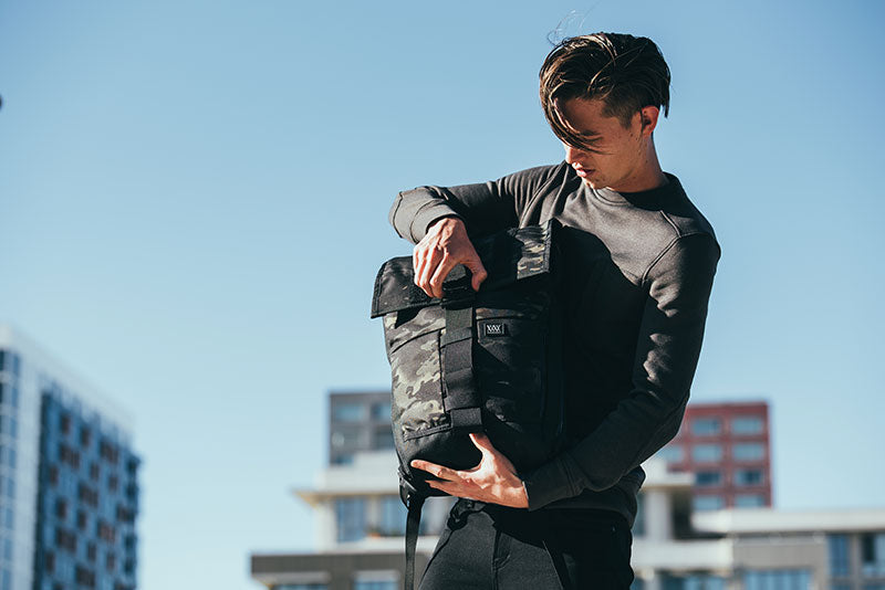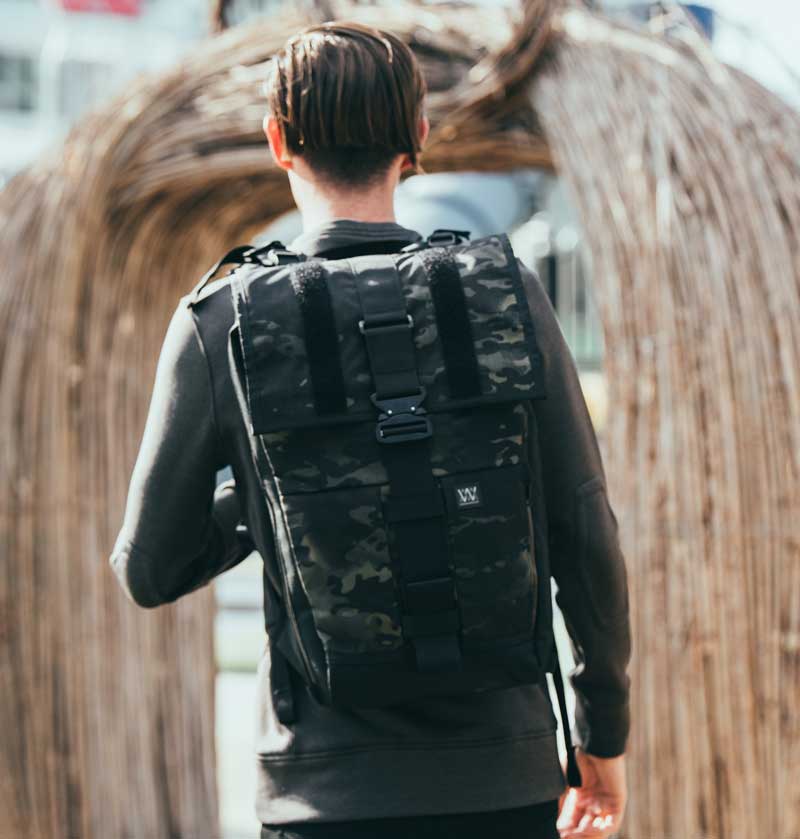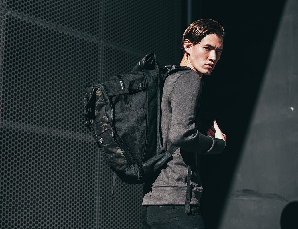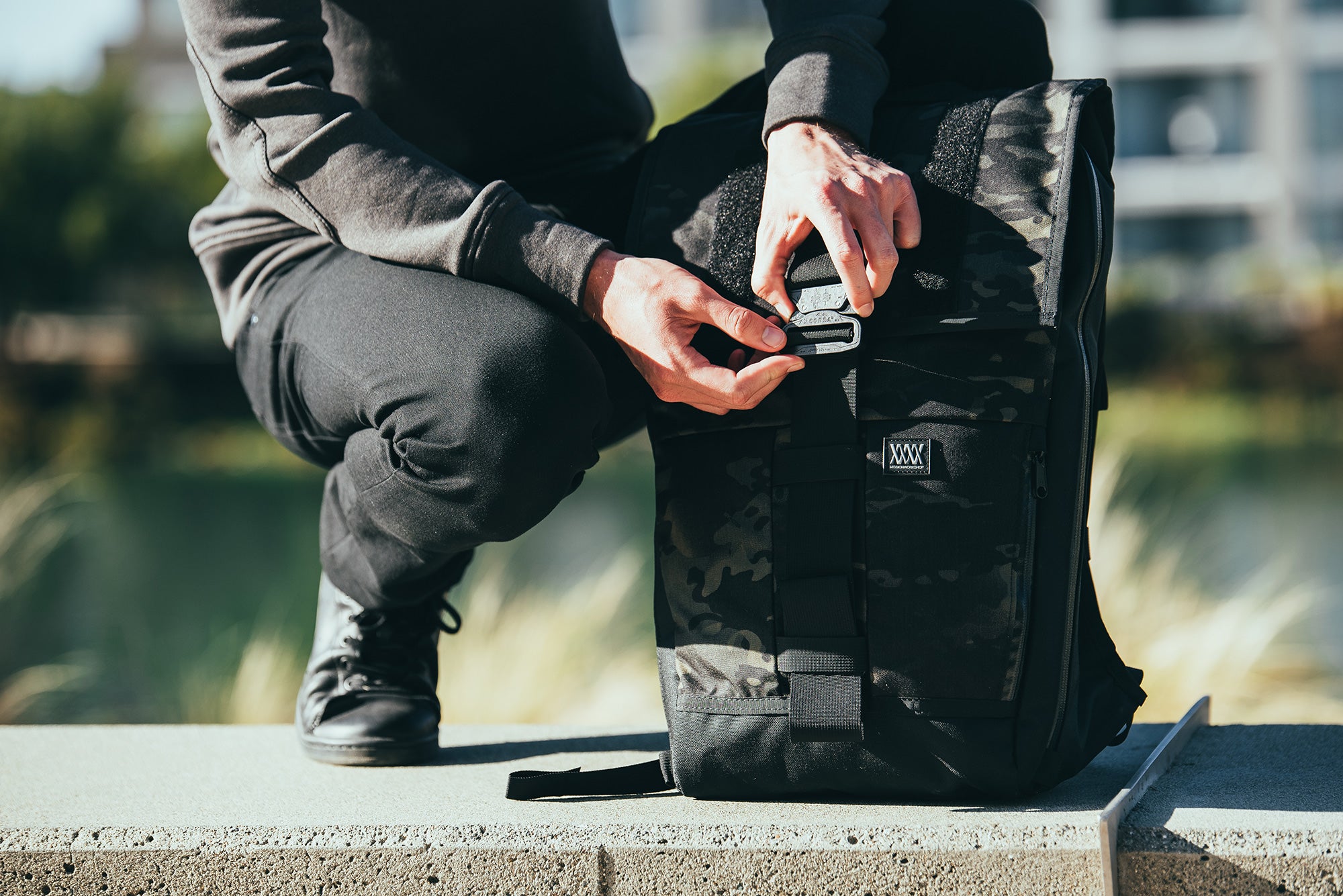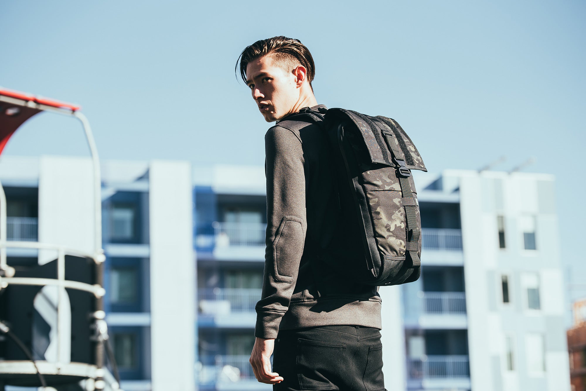 大小2つのフロントポケット、背面のロールトップ式スタッフコンパートメント、そして中央のメインセクション。また、ランブラーには防水素材、YKKアクアガード・ジッパーが採用され、ショルダーハーネスにはユーティリティ・ポーチを取り付けるためのアーキヴ・レールが2本付いている。