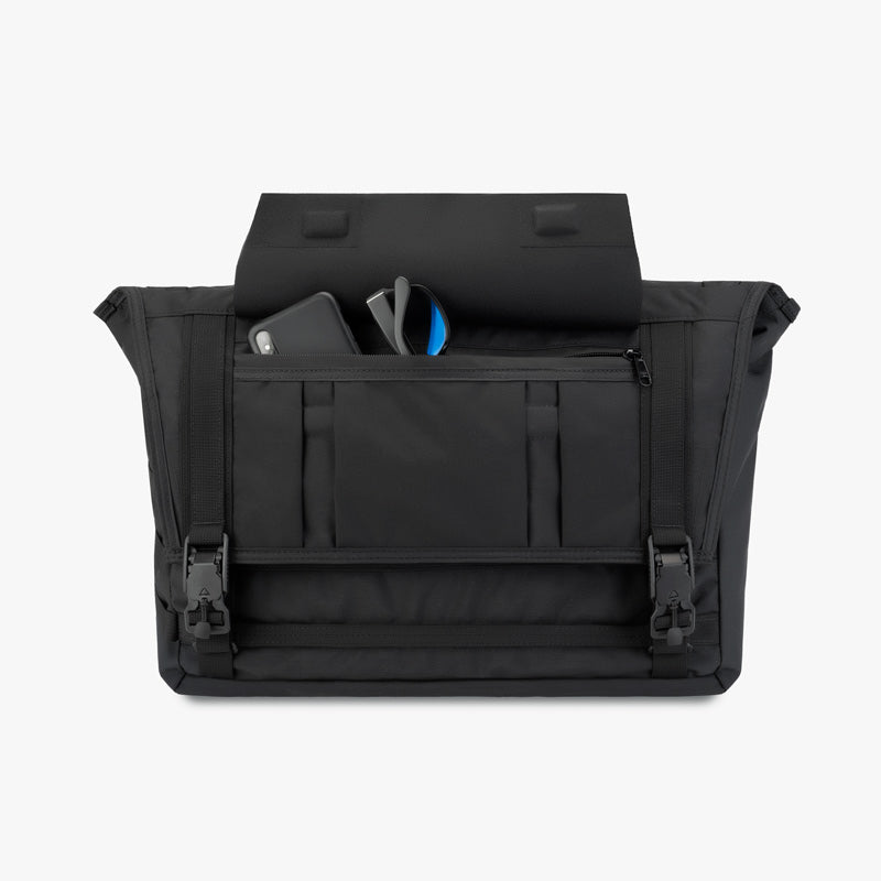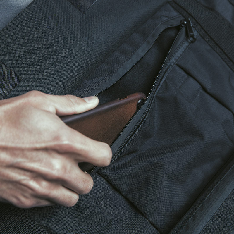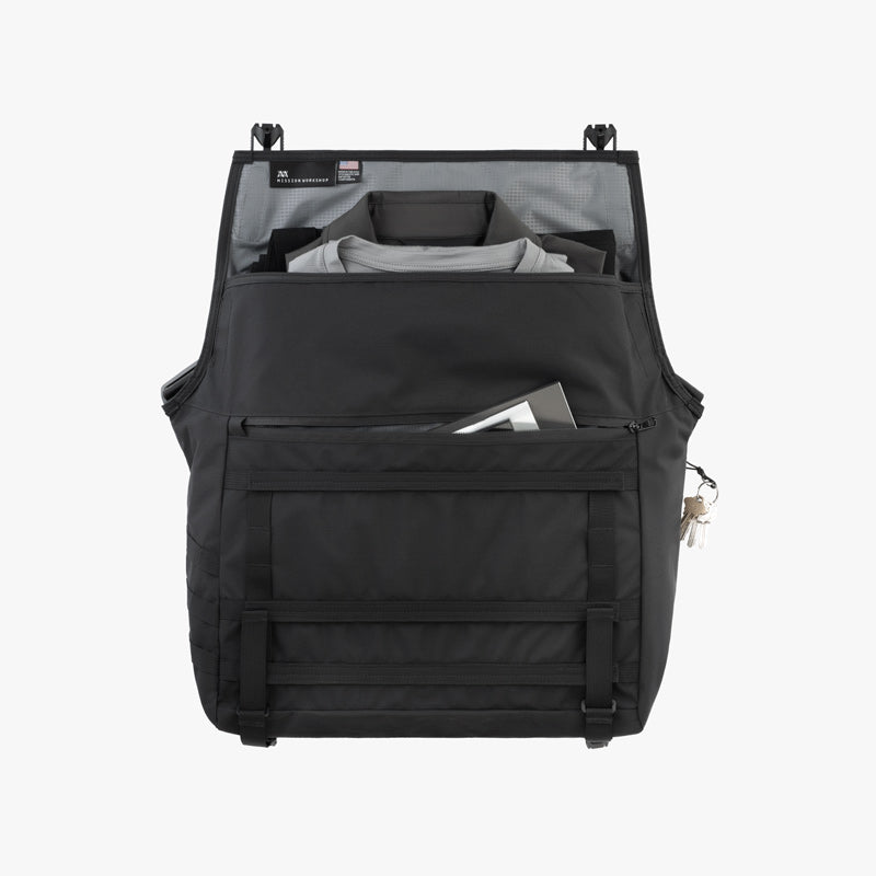 他のMission Workshop バッグ同様、Khyteは2層防水構造でギアを安全かつドライに保ちます。バッグ前面には、ノッチなどのArkivアクセサリーを取り付けるためのArkiv®レールが3本装備されています。