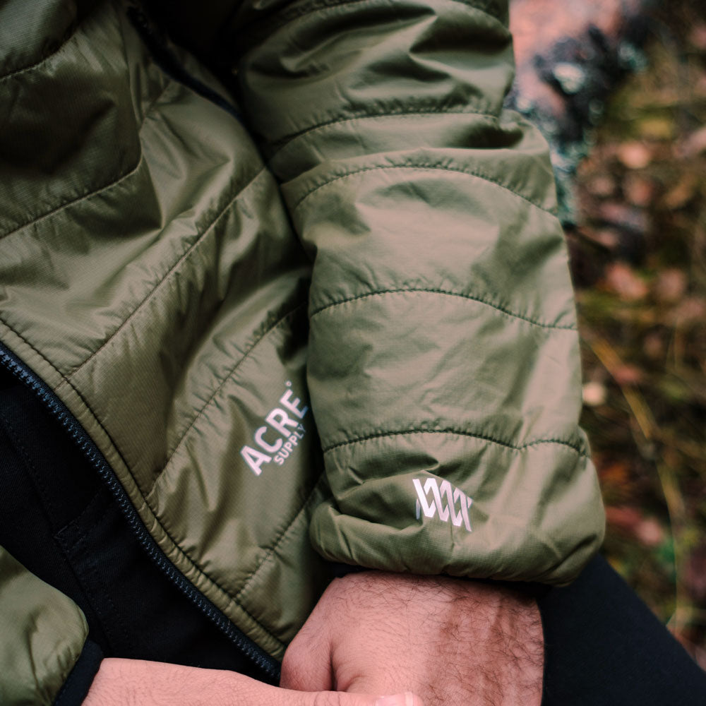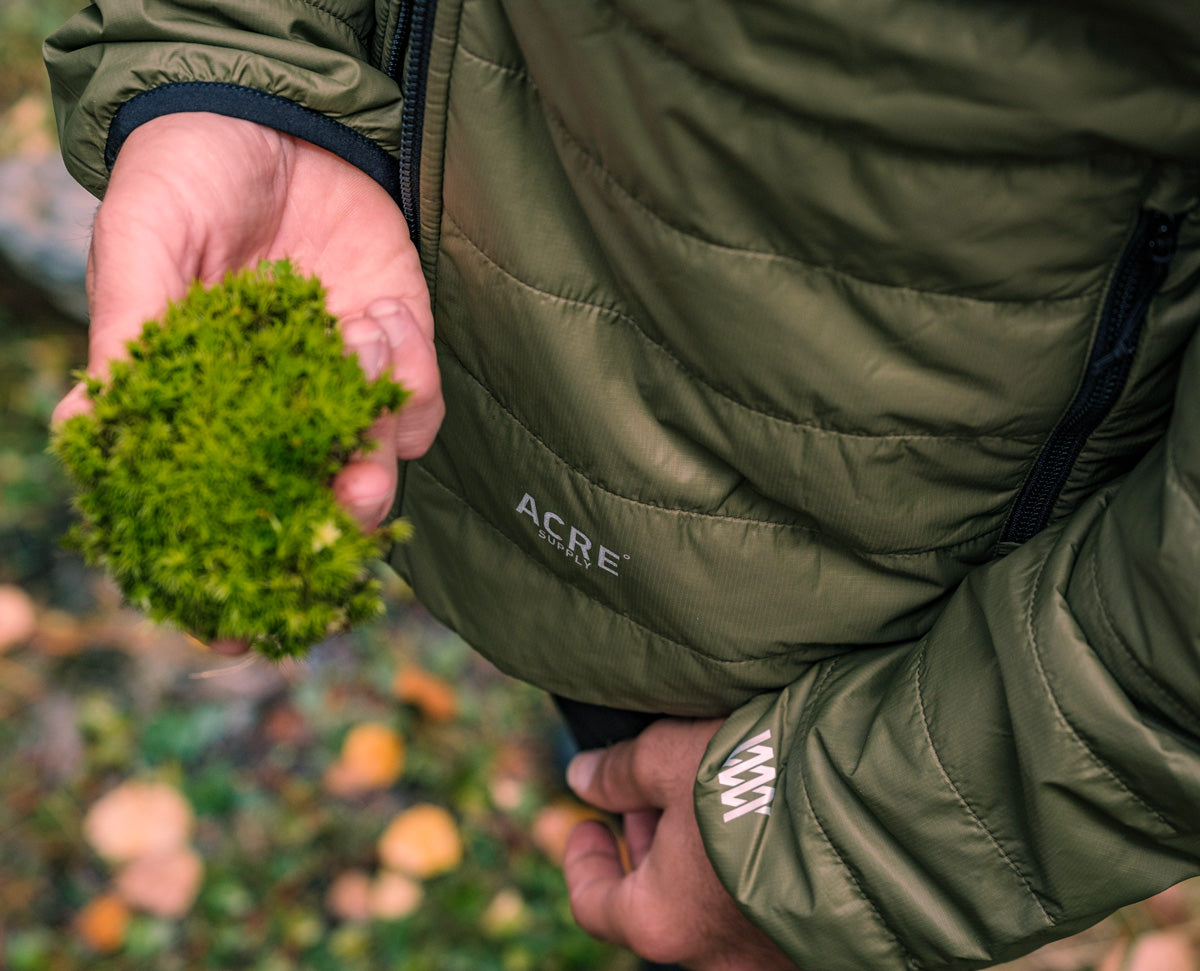 Pertex®Quantumフェイス素材はBLUESIGN認証を取得し、環境に優しいPFCフリーのDWR撥水加工を施しています。インサレーションにはPrimaLoft® 40g Gold Active+を使用し、Acre 、かさばることなく保温性を提供し、通気性に優れ、リサイクル繊維を55%使用しています。