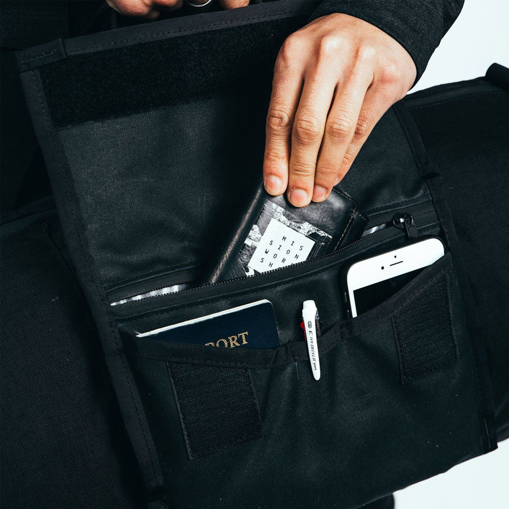 ミニフォリオは、旅行の必需品が簡単に収まる広々としたジッパー付きコンパートメントを備えています。携帯電話用の2つのフロントポケットと中央のペンスロットが整理性を高めます。