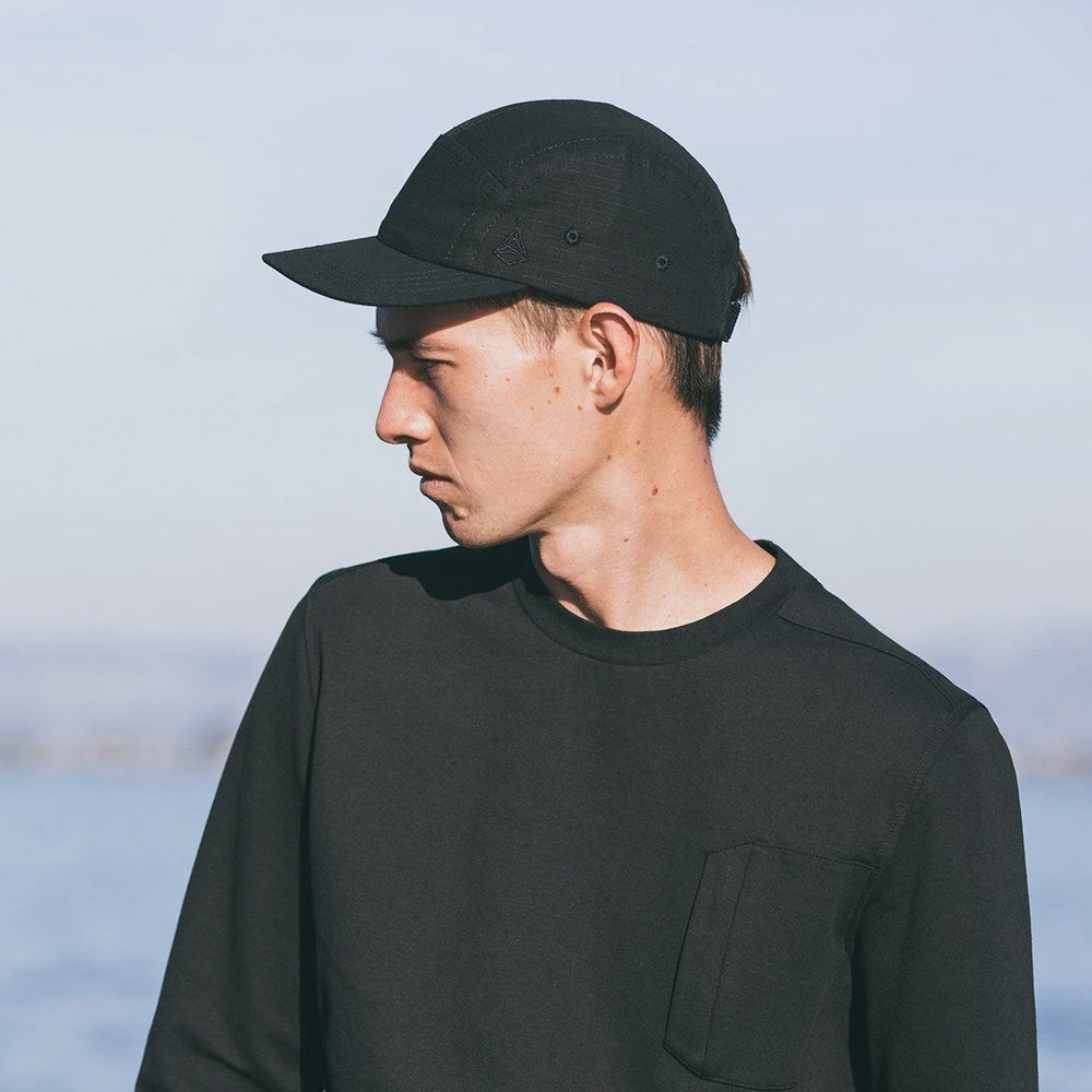 USA製のAcre 5パネルハットは、コットンリップストップ生地にAcre Supplyのダイヤモンドロゴをセルフ刺繍。調節可能なナイロンウェブストラップと通気性の良いアイレットを装備。カラーは3色:ブラック、オリーブ、ネイビー。