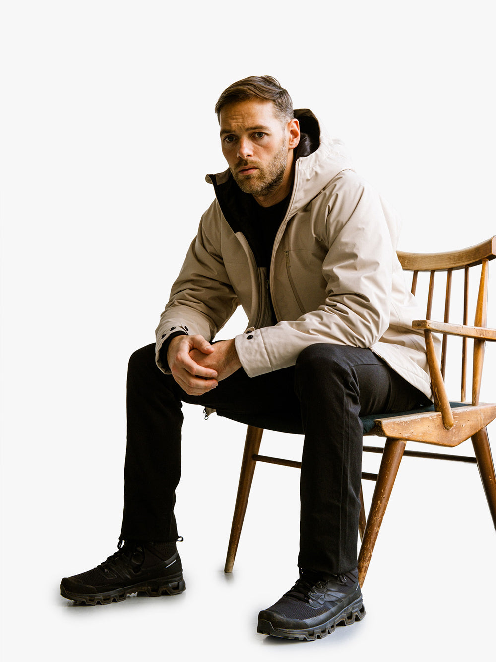 ディテールには、コードロックで調節可能な3パネルフード、首元までカバーするフルカバー、YKKアクアガード・ジッパーを各所に配し、フロントジッパーは2ウェイ仕様でベンチレーションを可能にする。ポケットはハンドウォーマーポケット2つ、チェストポケット、ジッパーとメッシュの内ポケット。