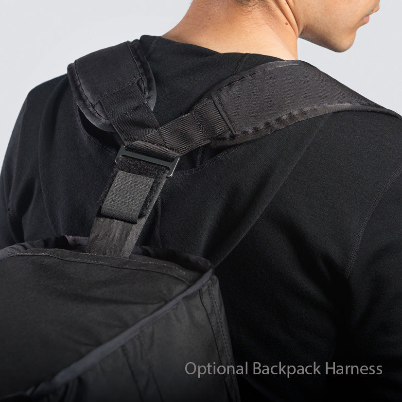 マストランジットは、使用しないときは収納できるグラブハンドルや、特注のアルミニウム金具を使用した取り外し可能なクイックアジャストショルダーストラップで持ち運ぶことができます。さらに、スナップアタッチメントポイントを使ってポータースタイルのバックラックに取り付けることも、オプションのハーネスを使ってバックパックとして背負うこともでき、長時間の移動でも両手が自由に使えます。