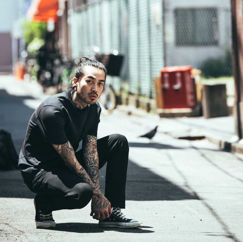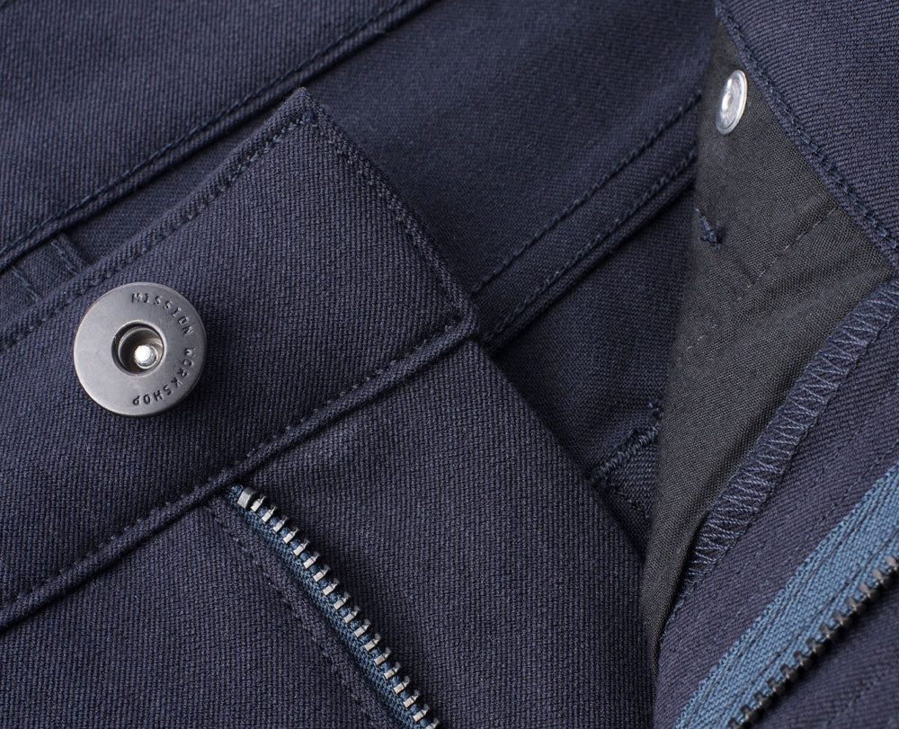 ミッション・ジーンズは伝統的なインディゴデニムで作られていない。その代わりに、イタリアのコモ湖にあるMectex M.I.S.の工場で、Mission Workshop のためだけに開発された先進的なストレッチ織物を使用している。この生地は耐久性や構造を犠牲にすることなく、非常に高いレベルの4ウェイ・ストレッチを実現している。