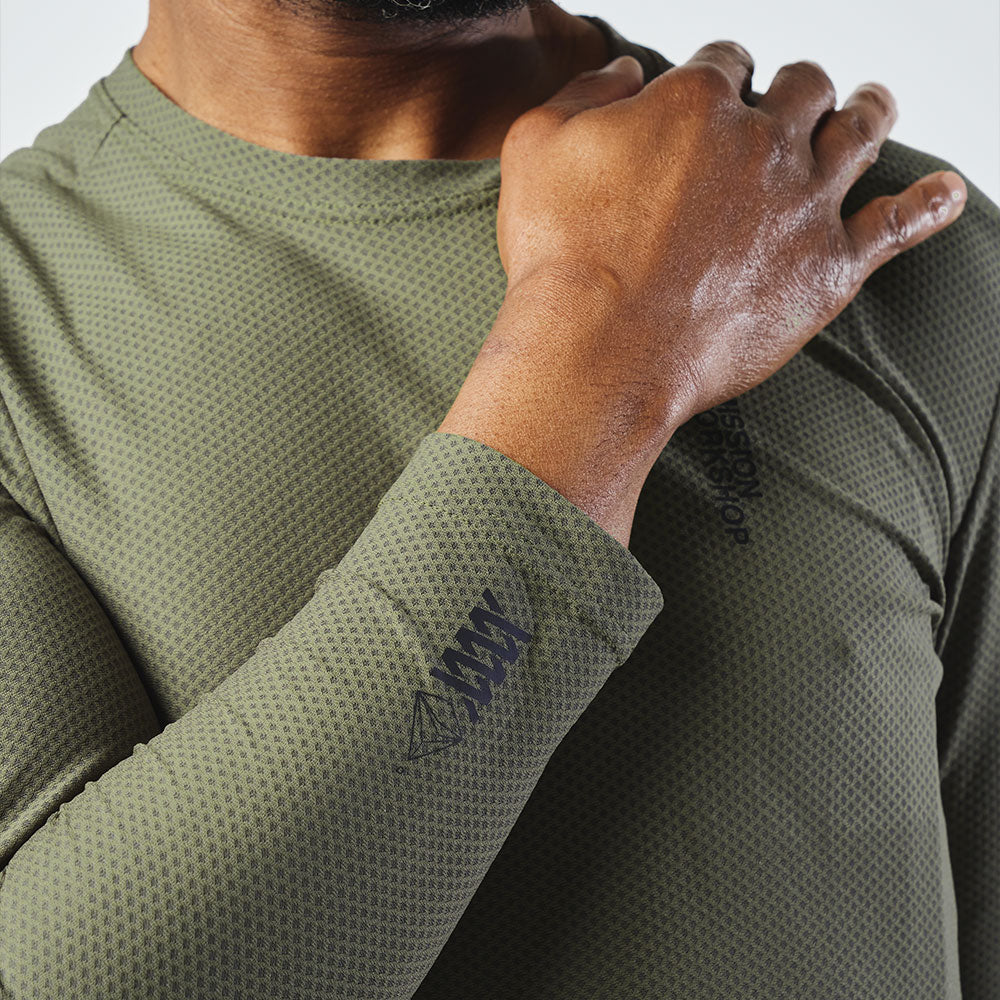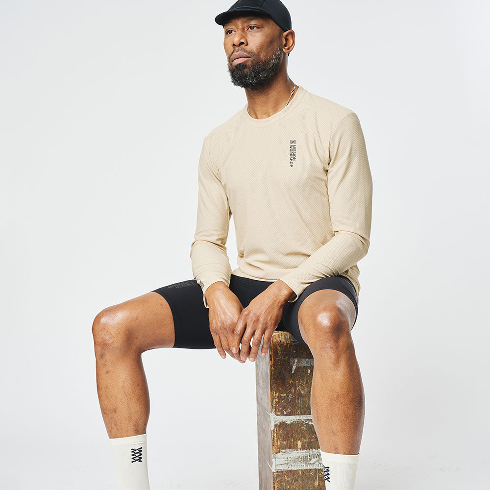 ミッション・プロ・テック・Tシャツ:LSは、通気性と速乾性のために表面積を飛躍的に増大させるイタリア製のオープンニット次元メッシュで構成されている。吸汗速乾性は2つの異なる糸を使用することで実現。ベースレイヤーとして、またジャージの代用として、あるいは日常着としての高機能ロングスリーブTシャツとして完璧に機能する。