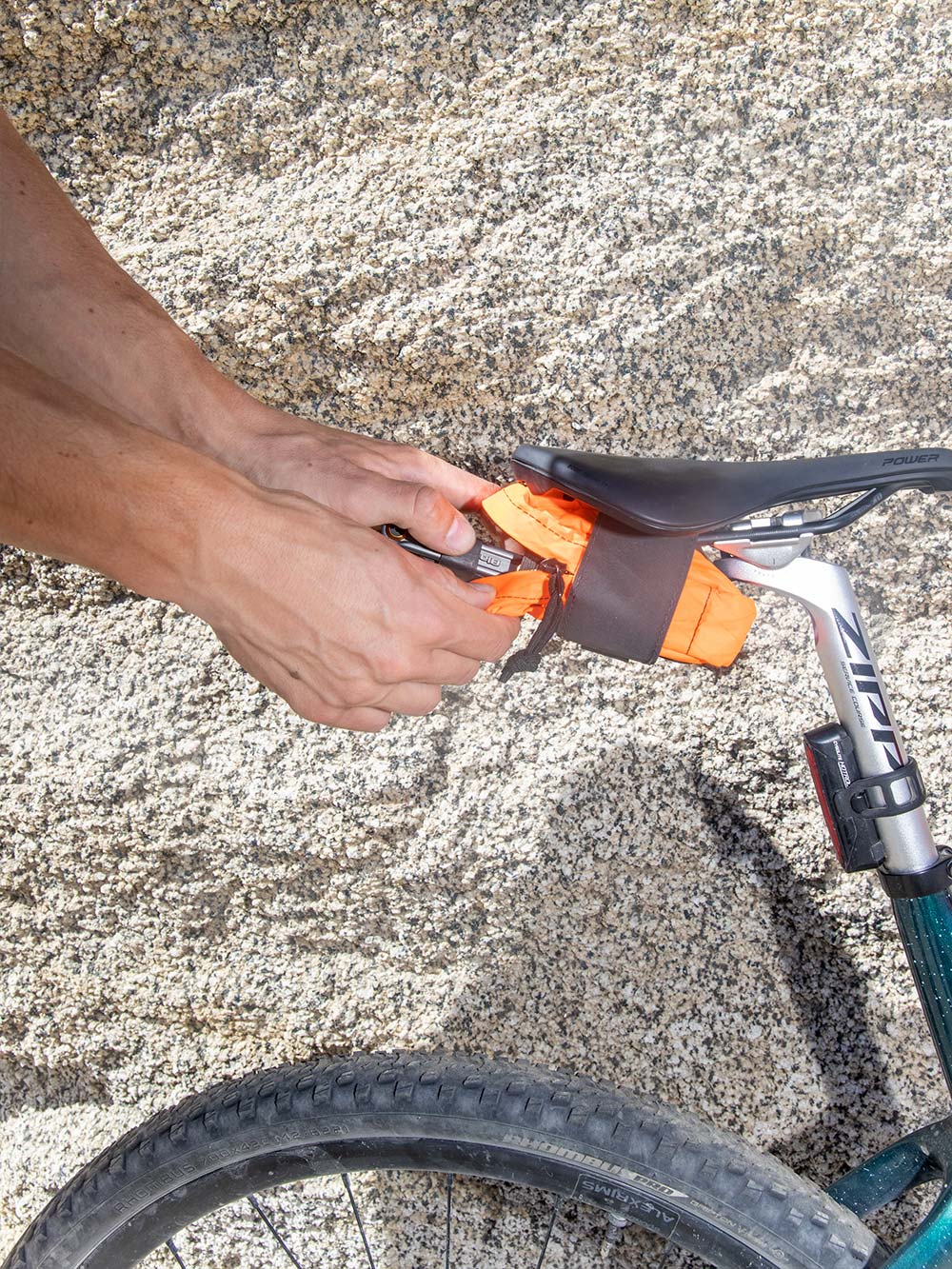 シート・アタッチメントに加え、幅広のハイパロン・ストラップは、ほとんどの自転車フレーム(トップチューブまたはダウンチューブ)にもしっかりと取り付けられ、必要に応じて追加収納が可能。