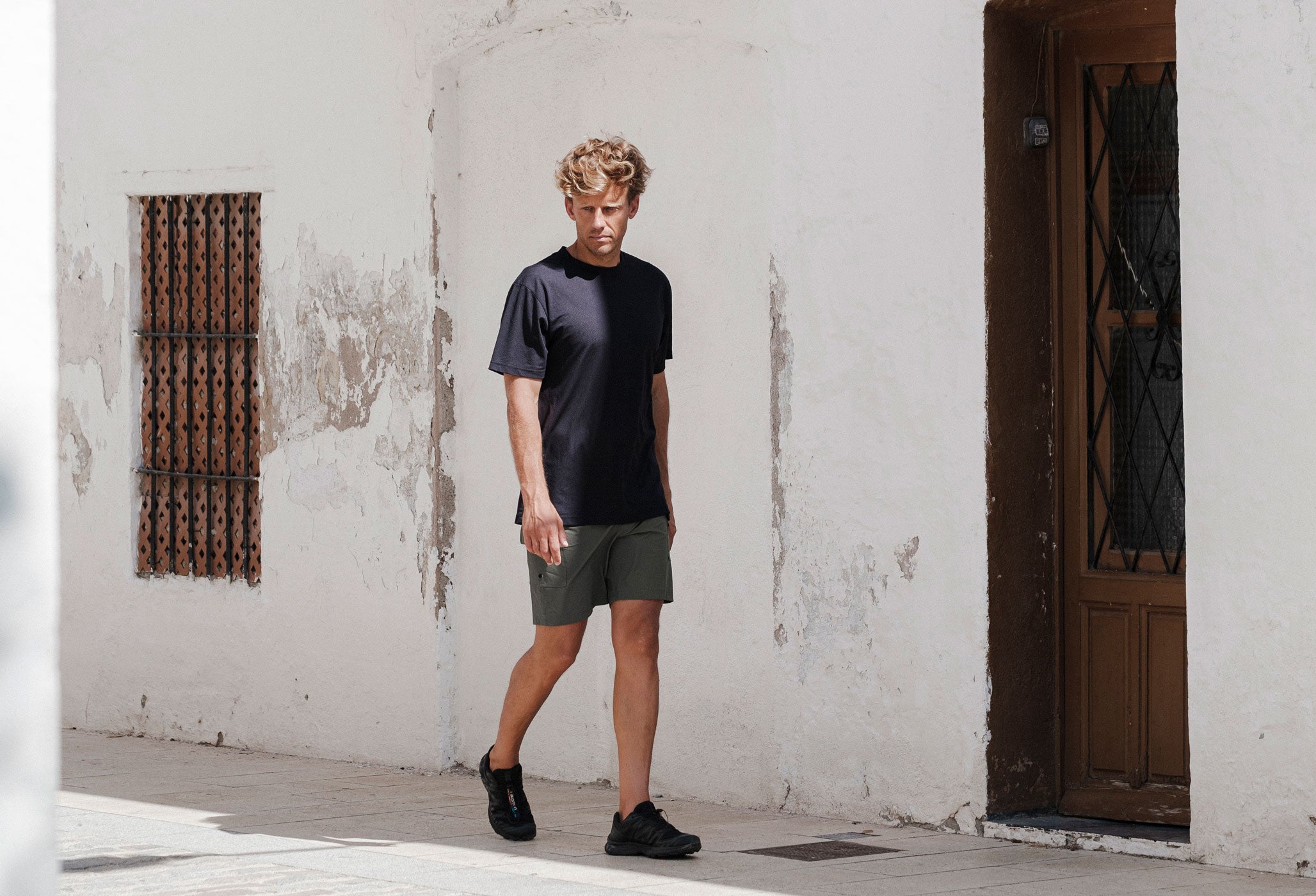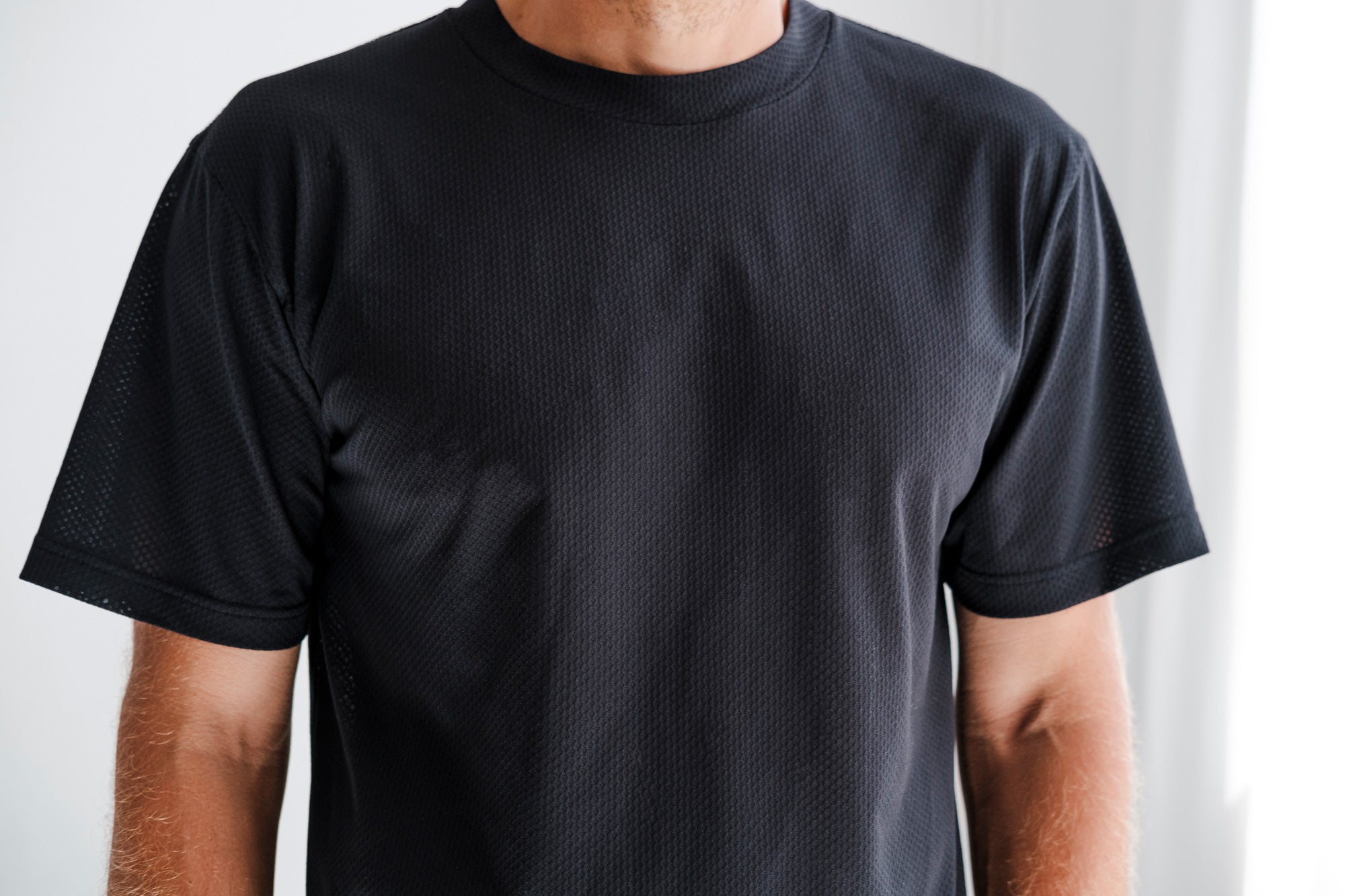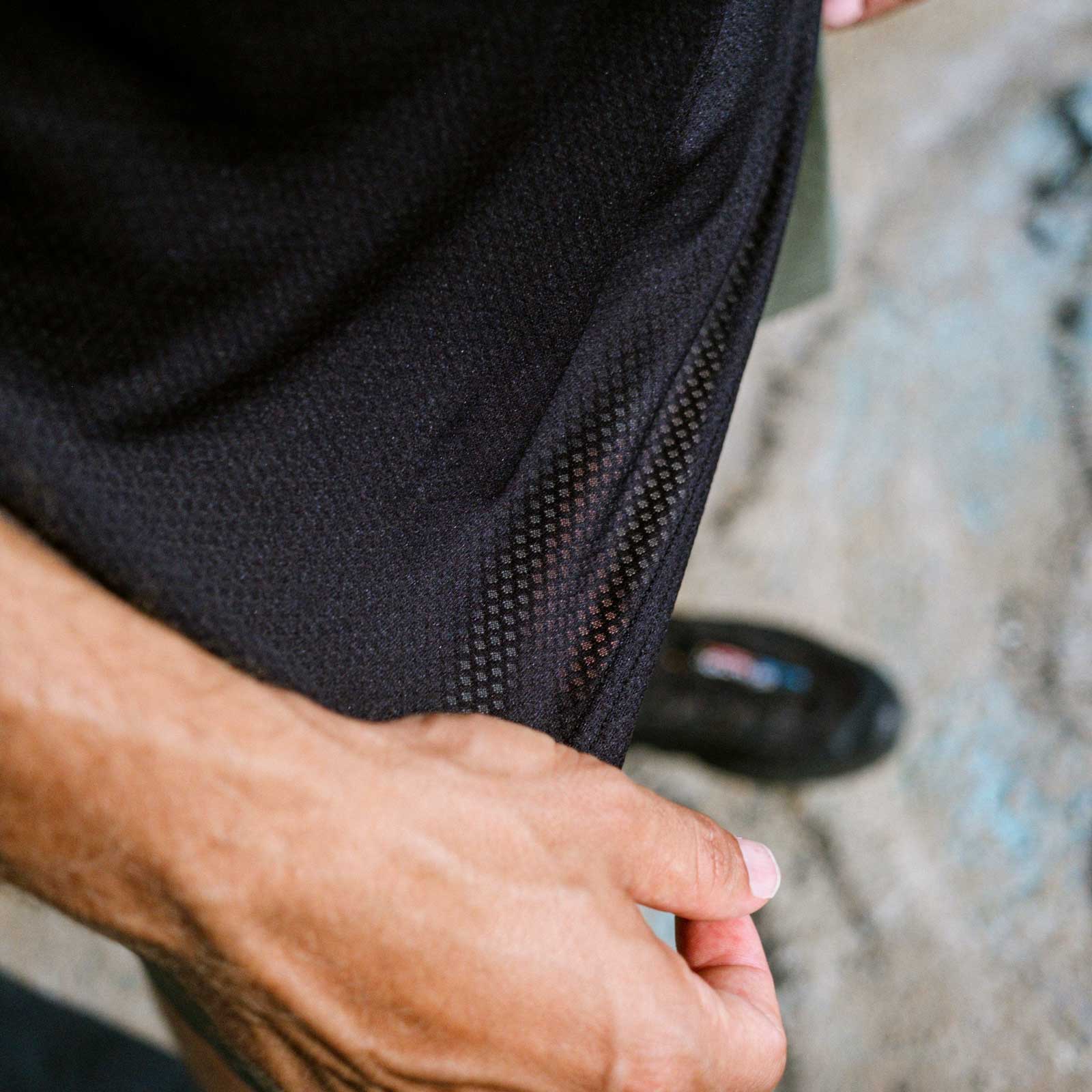ミッションTシャツ:クイックドライは、表面積を拡大することで抜群の通気性を実現したイタリア製オープンニット・ディメンジョン・メッシュを使用。二重糸構造により体から湿気を効果的に逃がし、どんなコンディションでもドライで快適な着心地をキープする。