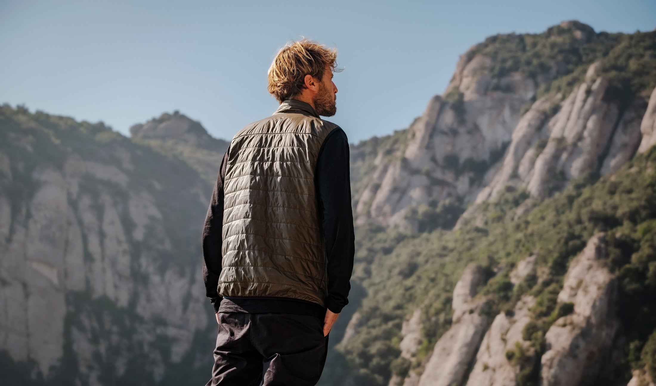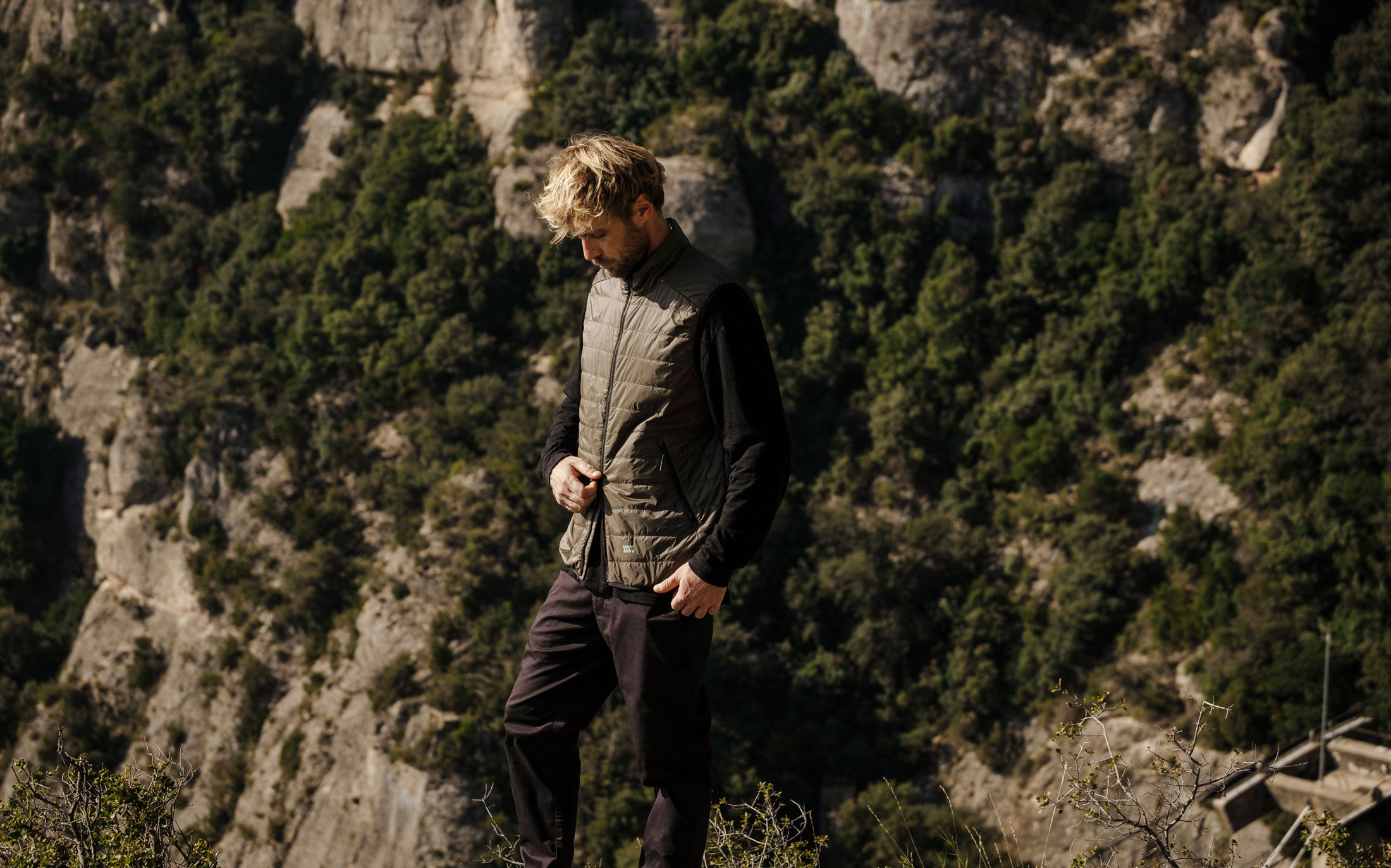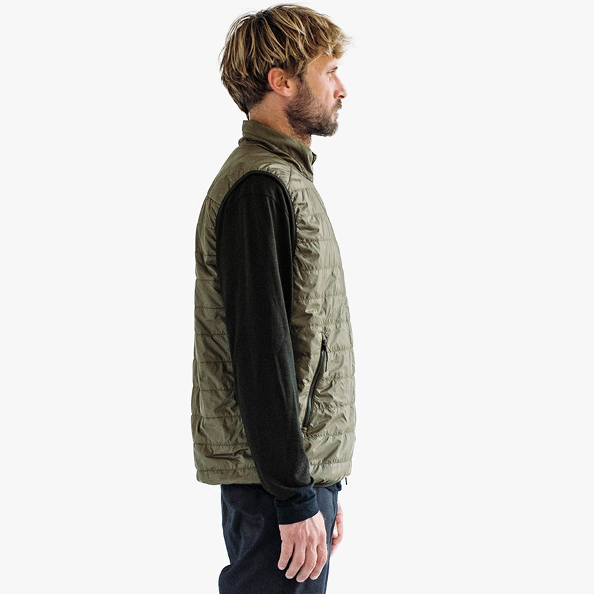 The ultralight nylon textile, produced in Como, Italy by the renowned technical mill Olmetex, delivers exceptional durability with a refined hand feel. Finished with an environmentally friendly C0 DWR (durable water repellent) coating, it sheds light rain, dries quickly, and provides reliable comfort through changing conditions. Insulated with 40g PrimaLoft® Gold which is made from 60% recycled fibers, the Mission Vest offers breathable warmth without bulk and sustainable performance across a wide range of environments.